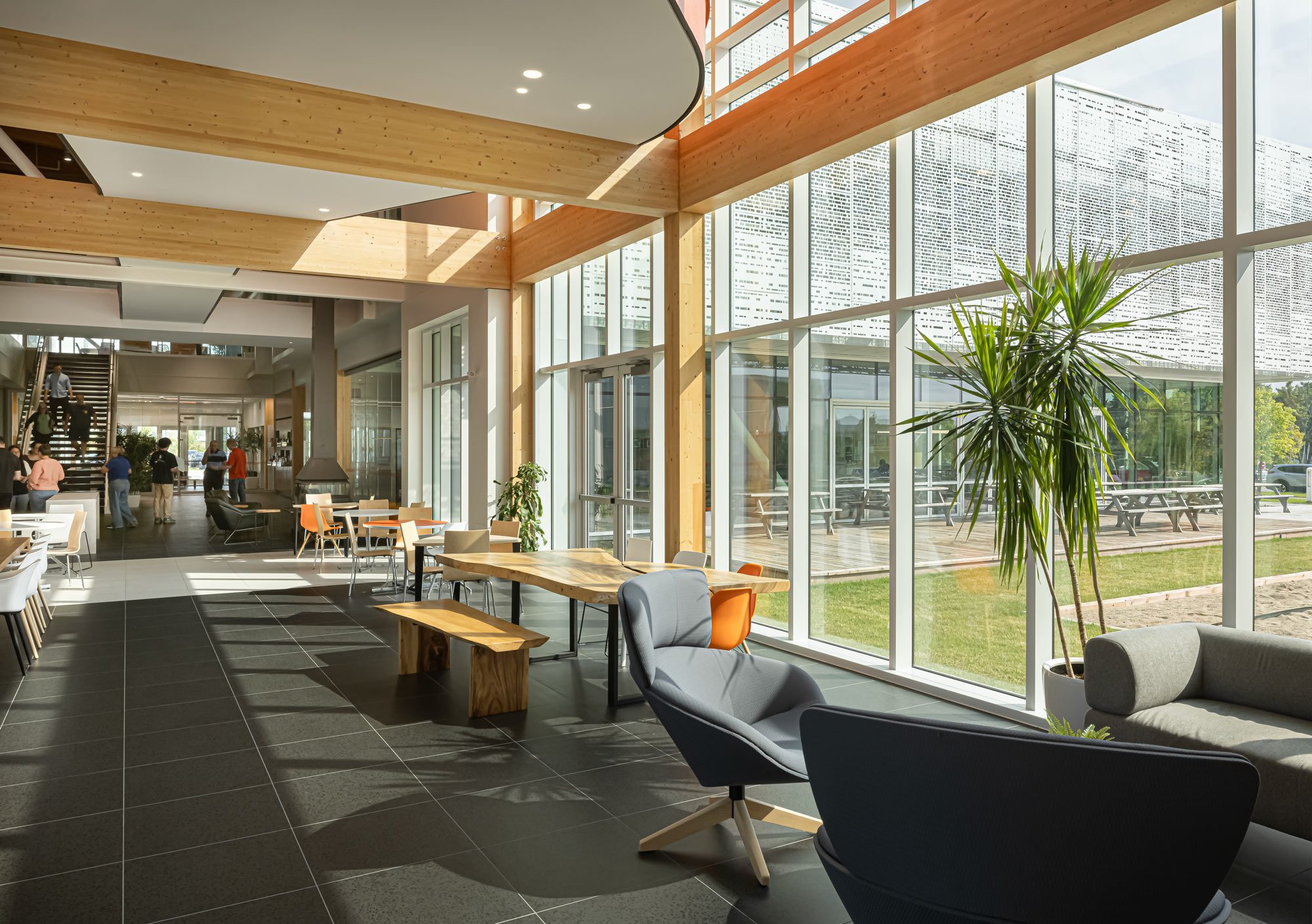 Réparties sur deux étages, les nouvelles installations d’Eddyfi comprennent des laboratoires au rez-de-chaussée et des bureaux ainsi que des espaces collaboratifs au 2e étage. Les espaces ouverts et vitrés de l’aménagement au 2e étage permettent une luminosité exceptionnelle pour les gens y travaillant. L’atrium existant, qui est l’élément clé architectural intérieur dans la phase 1, est prolongé via la passerelle. Du côté extérieur, le concept de 2e peau est reproduit sur la phase 2. Cette 2e peau ainsi que des brise-soleils viennent maximiser le gain énergétique des fenêtres et ainsi optimiser la performance globale du bâtiment. Les systèmes électromécaniques et l’enveloppe du bâtiment sont également très performants, permettant ainsi la certification BCZ. La structure de la présente phase suivra le même concept que la phase 1, c’est-à-dire un hybride acier-bois massif.